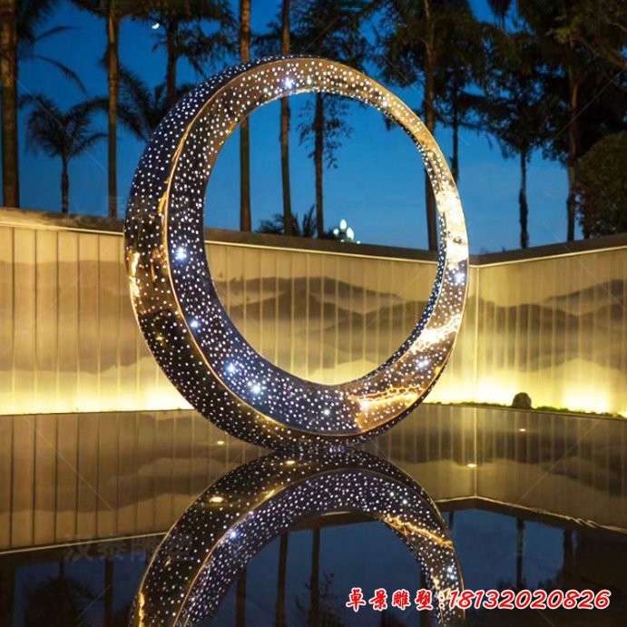 不銹鋼透光圓環(huán)雕塑之所以能夠透光是因?yàn)樗谋砻胬苗U空的工藝,可以將燈光透過(guò)來(lái),在晚上更能夠吸引人們的目光,有著特殊的裝飾效果。鏡面的效果在白天也是光潔明亮,非常具有時(shí)尚感。