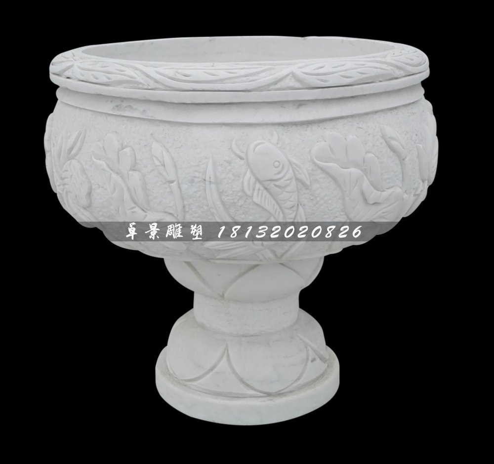 鯉魚荷花石浮雕花盆,漢白玉花盆石雕